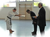 *Семь дней совестных тренировок* Более сорока участников со всей Германии, из Калининграда (Россия) и Минска (Беларусь) собрались в старинном городке на юге гор Харц, чтобы тренироваться под непосредственным руководством нашего грандмастера. И много чего было изучать! Помимо тренировок по кобудо были запланированы занятия по каратэ Сёрин-рю. Кайтё Тамаёсэ помогал в преподавании технический директор Тэссинкан Европы Франк Пельны (5 дан каратэ, 4 дан кобудо), а также Хаген Вальтер (2 дан каратэ, 2 дан кобудо). Ежедневно проводилось по три тренировки, на которых разбирались приемы боя от бо до сай для обладателей ученических степеней, а также дополнительные тренировки по сай, тимбэ для более опытных кобудока. Более того, Тамаёсэ посвятил одну из тренировок подготвке к Бо-сиай (поединки на бо), как части грядущего Чемпионата мира на Окинаве. Во вторник 9 августа состоялся Кубок Европы по Тэссинкан. Судейская